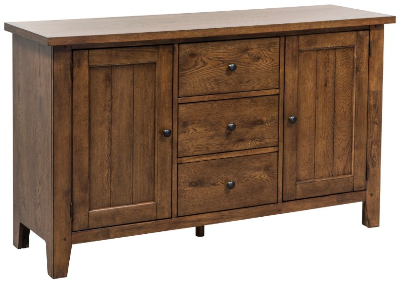 Reinvent your style with a memorable piece. The Hearthstone buffet is crafted of rubberwood solids and oak veneers and features a rustic oak finish and is accented with antique brass knob hardware. There are three full extension drawers with felt lining in all three that are flanked by two wood framed planked doors.Read More