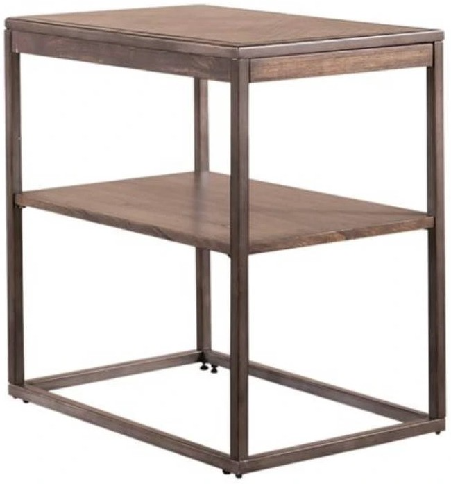 Simplify your urban space with the Jamestown chair side table. Crafted of rubberwood solids, metal tubes and mindy veneers, this piece features a tobacco finish, a diamond match veneer pattern, a lower level shelf for additional storage, and an appealing pull out tray perfect for placing your drinks.Read More