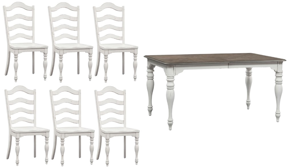 Sitting pretty with the Magnolia Manor seven-piece leg table set, consisting of six ladder back side chairs and a leg table. Crafted of poplar solids and white oak birch veneers, this kit features an antique white finish with a weathered brown top with whitewash.Read More