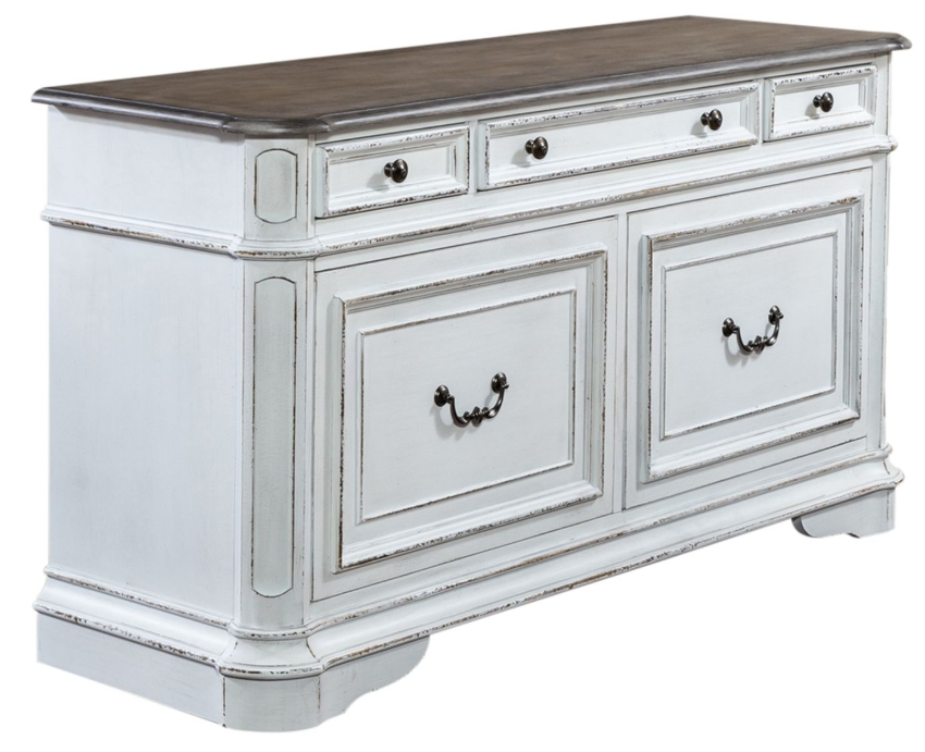 Blend European influences to create the Magnolia Manor credenza. Crafted with poplar and rubberwood solids with white oak and birch veneers, this piece features two large file drawers and three fully stained full extension drawers accented by antique pewter bail pull and knob hardware.Read More